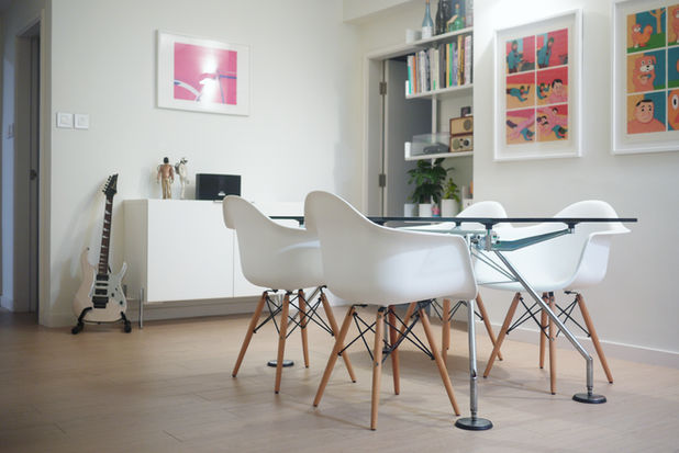 The 3-bedroom apartment has been transformed into a generously spacious 2-bedroom setting. The master bedroom merging with the original guest room takes away the requirement of a long corridor and door clearances. The extra space significantly benefits the closet / study area and maximizes cross-ventilation. Closets are either positioned against the wall or back-to-back to hide their bulkiness. White walls, reflective surfaces, glass tabletop are all selected in order to bring natural sunlight deep into every corner of the home.