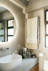 Light grey tiles and cement panels are used to compliment the white walls in the bedroom, the bathroom and the kitchen so that the art pieces are the accents themselves in regards to the overall interior, similar to that of a museum.